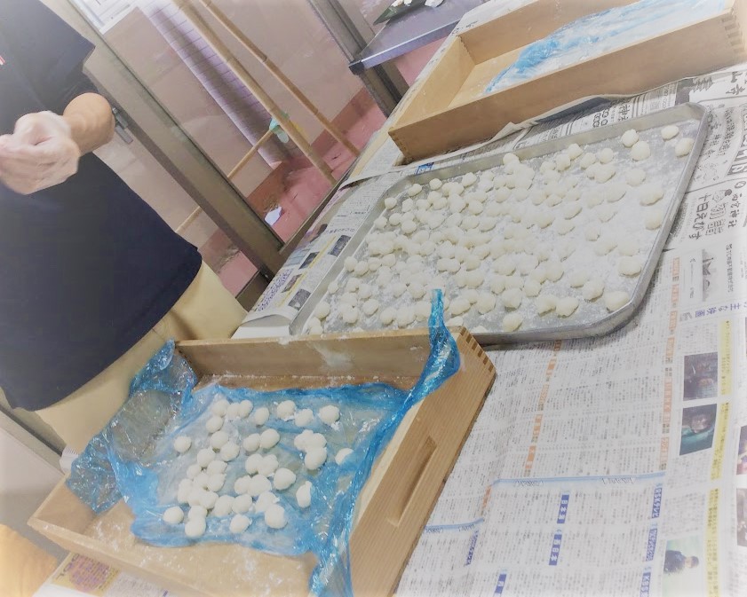丸めたお餅はお湯で湯がいて柔らかくして味付けしていきます。