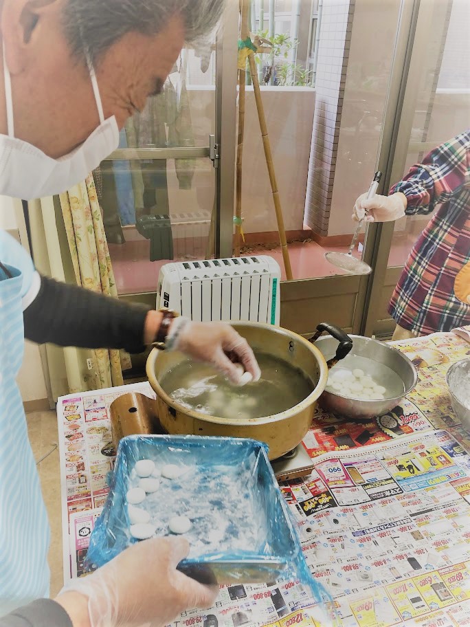 丸めたお餅はお湯で湯がいて柔らかくして味付けしていきます。